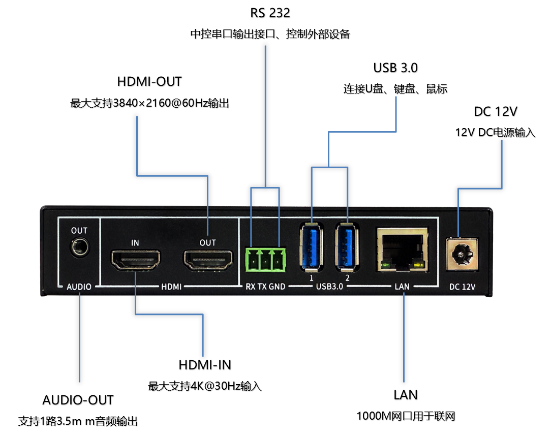 ✦支持2路USB3.0,用于多媒体素材播放和功能扩展(键盘和鼠标接入功能、U盘升级等)。