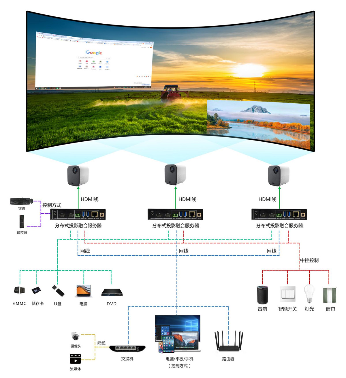 ✦轻量化,可扩展,每个分布式节点不仅可以单独作为媒体服务器使用,精确的网络时钟同步系统也可以将多个分布式节点任意组合来满足多通道投影融合的需求。